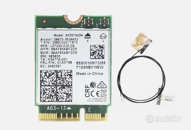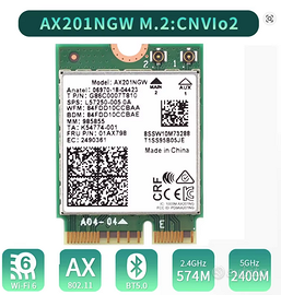 Vendo modulo di rete Intel AX201NGW, form factor M.2 2230 Key E, Nuovo sigillato Specifiche tecniche Chipset: Intel Wi‑Fi 6 AX201 Interfaccia: M.2 2230 A/E Key (CNVi) Standard wireless: IEEE 802.11ax/ac/n/a/b/g Bande: 2.4 GHz / 5 GHz Velocità teorica: fino a 2.4 Gbps (80 MHz / 160 MHz) Bluetooth: versione 5.1 MU‑MIMO, OFDMA, Target Wake Time, WPA3 supportati Compatibilità: notebook e mini‑PC con supporto CNVi / CNVio2 Perfetto per upgrade di sistemi Lenovo, HP, Dell, Asus, Acer, MSI e altri modelli compatibili con moduli CNVio2.