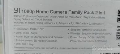 vendo confezione, ancora incellofanata, contenente due telecamere ip da interno fisse. collegabili solo in wifi 2.4ghz e con app dedicata yi home.