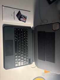 iPad 10 generazione in condizioni pari al nuovo, acquistato a aprile dell’anno scorso perciò ancora in garanzia in caso di guasto, con cover nera (guardare foto per condizioni, ha un piccolo strappo alla parte potesriore) HO ANCHE LA FATTURA DI ACQUISTO, Pencil Bluetooth con scatola, punte nuove e caricatore mai usati, cover Magic Keyboard color grigio scuro, con 6 opzioni di retroilluminazione, con scatola e caricatore nuovo mai usato (ho applicato dei stretch all’iPad e alla cover per rendere l iPad più sicuro nell’utilizzo con la cover con tastiera, volendo possono essere rimossi). In più in omaggio due caricatori per iphone/ iPad (fino a 9 generazione) uno più lungo e uno più corto completamente nuovi con porta tipe-c.