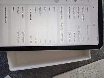 Vendo Ipad 10.gen 256 GB solo wifi 1 anno di vita schermo perfetto unico difetto un piccolo segnosul lato in basso evidenziato in una foto, con fattura di acquisto scatola e cavo di ricarica,cover bianca con tastiera touch Pad non originale ma perfetta con protezione in silicone trasparente..