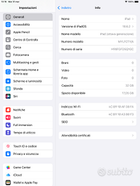 Vendo Apple iPad 8ª generazione da 32GB Wi-Fi, perfettamente funzionante. Display da 10,2”, ottimo per studio, streaming e navigazione sia come schermo sia per le prestazioni. - Condizioni: molto buone - Presente un leggero graffio sullo schermo (visibile solo a schermo spento, non si sente al tatto e non dà fastidio durante l’uso) - Batteria in buono stato (utilizzato pochissimo solo da una persona anziana) Prezzo: 140,00 euro trattabili Consegna a mano o spedizione a carico dell’acquirente.