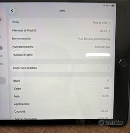 Vendo per passaggio a modello superiore iPad di ottava generazione, perfettamente funzionante e tenuto con cura. È il compagno ideale per lo studio (compatibile con Apple Pencil di 1ª gen), lo streaming o il lavoro leggero. Caratteristiche principali: • Modello: iPad 8th Gen (A2270) • Capacità: 32 GB • Display: Retina da 10.2 pollici (colori brillanti e ottima risoluzione) • Software: Aggiornato all'ultima versione disponibile • Stato Batteria: Ottima autonomia, regge tranquillamente la giornata di utilizzo. Condizioni estetiche: Il dispositivo è in ottime condizioni, sempre tenuto con cover e pellicola Cosa è incluso: • iPad 8ª Gen • Completo di scatola originale e cavetto • Incluso nel prezzo cedo cover Disponibile per scambio a mano a Torino per qualsiasi prova. Disponibile anche alla spedizione tramite TuttoSubito.