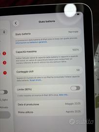 Vendo iPad di 11ª Generazione (Modello 2025) con chip A16 Bionic, colorazione [Argento]. Il dispositivo è in condizioni estetiche impeccabili: non presenta graffi, ammaccature o segni di usura né sul display né sulla scocca. È stato tenuto maniacalmente sin dal primo giorno. Caratteristiche Principali: • Memoria: 128 GB • Stato Batteria: 100% di capacità massima (dimostrabile da impostazioni). • Chip: A16 Bionic, estremamente fluido e veloce per multitasking e gaming. Cosa è incluso: • Scatola originale integra. • Cavo di ricarica originale Apple (USB-C). • Alimentatore originale.