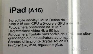 iPad A16, in confezione, mai usato. Valore 550 €. RITIRO A MANO, ZONA DI BARI E DINTORNI