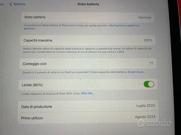 📱 iPad Air 13” (2024 – M2) 128GB + Apple Pencil Pro – pari al nuovo Vendo iPad Air 13 (2024) da 128GB completo di Apple Pencil Pro. 🔝 Condizioni: pari al nuovo ✔️ Batteria al 100% (solo 77 cicli – vedi foto) ✔️ Utilizzato pochissimo, nessun difetto ✔️ Sempre tenuto con cura 📦 Incluso: - iPad Air 13” (2024 – chip M2) - Apple Pencil Pro - Scatole originali di entrambi 💡 Perfetto per: - università (appunti, PDF, studio) - disegno digitale e creatività - lavoro e produttività ⚡ Prestazioni elevatissime grazie al chip M2 e al display ampio da 13” 💰 Prezzo: 700€ 📍 Consegna a mano o spedizione Vendo per inutilizzo. Per qualsiasi informazione o ulteriori foto, scrivimi senza problem