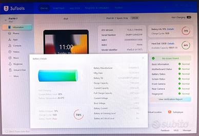 Batteria al 74% verificata con App 3uTools. Il dispositivo è stato inizializzato per la consegna.