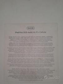 Vendo iPad Pro (10.5-inch) Wi-Fi + Cellular da 64GB completo di scatola, cavo per ricarica e caricatore non originale ma presente.