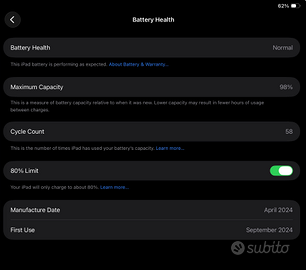 Vendo iPad Pro 11" M2, 128 GB, in ottime condizioni. Usato sempre con vetro in gomma e custodia. Dettagli: Modello: iPad Pro 11" con chip M2, 128 GB Batteria: 98% di salute Apple Pencil Pro inclusa Pellicola in vetro già applicata Custodia protettiva inclusa Nessun graffio importante o difetto funzionale Scatola NON presente, fornisco solo iPad e accessori indicati Perfetto per studio, lavoro, contenuti multimediali. Scrivimi in chat per foto dettagliate o altre informazioni.
