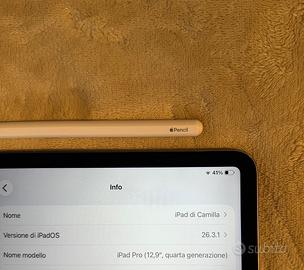 Vendo iPad Pro 12.9 pollici 512Gb +ApplePencil (quarta generazione) in ottime condizioni. Il dispositivo è sempre stato tenuto con cura ed è perfettamente funzionante in ogni sua parte. ✅ Batteria: dura benissimo e si carica senza problemi ✅ Prestazioni: fluido, veloce, ideale per studio, appunti e lavoro ✅ Display: perfetto, nessun difetto ✅ Colore: grigio siderale (molto elegante) 🔎 Presenta solo piccole imperfezioni sugli angoli (normali segni d’uso), che non influiscono minimamente sul funzionamento ✏️ Inclusa Apple Pencil Perfetto per studenti o per chi cerca un tablet potente a prezzo più conveniente rispetto al nuovo. 📦 Spedizione veloce 💬 Per qualsiasi domanda scrivimi!