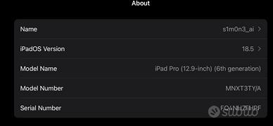 Vendo *iPad Pro 12.9" (6ª generazione)*, modello Wi-Fi da *256GB*, in condizioni *eccellenti*, perfettamente funzionante e pronto all’uso. Questo dispositivo è ideale per professionisti, studenti, creativi e chiunque cerchi potenza, versatilità e stile in un unico strumento.