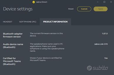 L'integrazione completa fra un dispositivo Jabra e un softphone per computer funziona solo se combinata a un adattatore Bluetooth Jabra Link.