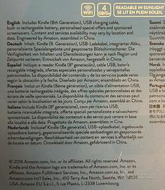 Vendo come da foto Kindle originale Amazon, wi-fi, anno 2016, 8a generazione, di capacità massima 4GB. Il prodotto è praticamente nuovo, mi è stato regalato e praticamente mai utilizzato, solo acceso per prova e provato a scaricare qualche contenuto online. Il tutto è completo di scatola e istruzioni