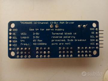- 1× scheda driver PCA9685 16 canali, risoluzione 12-bit, interfaccia I²C, logica 3–5V, alimentazione V+ fino a 6V, frequenza 40–1000 Hz