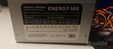 - Alimentatore 500W Energy 500. Alimenta i3 e i5 fino alla tredicesima generazione senza sforzi. Anche adatto per CPU della serie 3000 e 5000. Arriva con incluso il proprio cavo di alimentazione e un cavo 4pin-4 pin per estendere la portata del cavo che alimenta la CPU.