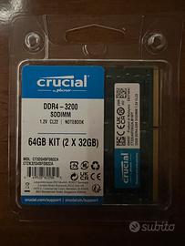 Vendo kit di memoria RAM Crucial da 64GB, composto da due moduli accoppiati da 32GB ciascuno. Si tratta di memorie DDR4 con frequenza di 3200MHz e fattore di forma SODIMM. Usate poco vendo per passaggio a nuovo pc
