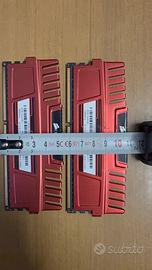 Vendo kit di memoria RAM Corsair Vengeance Red da 8GB (2 moduli da 4GB), modello CMZ8GX3M2A1866C9R. Ideali per ridare vita a PC da gaming o workstation basati su piattaforme DDR3 (Intel serie 2000/3000/4000 o AMD FX). Specifiche tecniche: • Capacità: 8GB (2 x 4GB) Dual Channel. • Frequenza: 1866MHz (più veloci delle classiche 1333/1600MHz). • Latenza: CL9 (9-10-9-27) a 1.50V, per prestazioni reattive. • Estetica: Dissipatore in alluminio anodizzato rosso ad alte prestazioni. •(alti circa 52mm). Verificate che non ci siano interferenze con il dissipatore della vostra CPU.