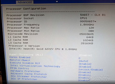 vendo kit così composto: scheda madre: Supermicro X11SPI-TF processore: Intel Xeon Gold 6122/Intel Xeon Gold 6222v (in base alle disponibilità sono praticamente identici di prestazioni) RAM: 6x16GB DDR4 ECC. tutto perfettamente testato e funzionante