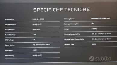 Come da titolo vendo kit sodimm per computer portatili marca corsair modello Vegeance , il kit é composto da n°2 banchi ram da 32gb l'uno. lo ho acquistato insieme alla mia workstation nel 2024 e sostituite dopo pochi mesi per passaggio alla versione con frequenza 5600 , sono praticamente nuove.