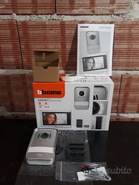 Kit videocitofonico bticino composto da postazione esterna nuova mono/bifamiliare,alimentatore,istruzioni d'uso e installazione e accessori per l'installazione.