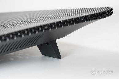 Le ventole sono silenziosissime e la griglia in metallo traforata fornisce un buon supporto per l'appoggio anche per i portatili più pesanti. La parte inferiore, in plastica, è dotata di piedini retrattili che permettono l'inclinazione con due angolazioni diversi.