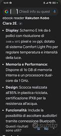 Kobo nuovo, ricevuto per regalo. L'ho solo provato. È ancora dotato di garanzia, essendo stato acquistato i primi di Marzo 2026. Caratteristiche come da foto. Regalo cover blu scura.