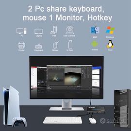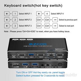 Vendo come da descrizione, un KVM Switch 2x1 8K@60Hz 4K@120Hz, HDCP2.2 HDR, USB3 di EZCOOTECH. Lo trovate anche su amazon, potete verificare qualità e caratteristiche. Queste le caratteristiche principali: - 2 porte HDMI 2.1 KVM Switch Dual Monitor: 2 porte HDMI2.1 KVM switch Controllo 2 computer o laptop con un set di tastiera cablata o wireless, mouse e 2 monitor estesi o specchiati allo stesso tempo. - Interruttore KVM 4K 120Hz HDMI Audio Video: Interruttore KVM USB 3.0 Dual Monitor supporta HDMI standard 2.1 con HDR10 e effetto 3D, alta risoluzione fino a 8K@60Hz 4K@120Hz - Switch HDMI 2.1 KVM 2x1 Facile da configurare: Plug and Play, cavo USB Mirco per alimentazione. 8K qualificati I cavi HDMI 2.1 sono consigliati se si desidera ottenere un segnale 8k. - Lo switch KVM a 2 porte supporta HDCP 2.2 ad alta velocità con larghezza di banda HDCP 2.2, altamente compatibile con tutti i sistemi operativi come Windows, Mac OS, Linux. Funziona perfettamente con Xbox One X, PS4 Pro, 4K, Roku 4, Amazon Fire TV, lettori Blu-ray ecc. E' perfettamente nuovo, ancora sigillato (come visibile in foto). Prezzo di mercato 170 euro
