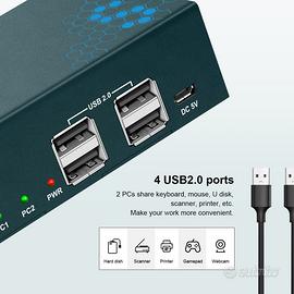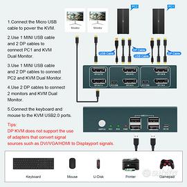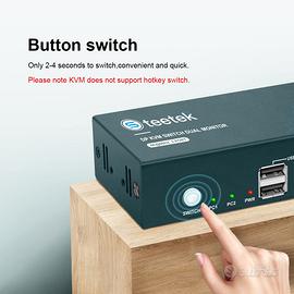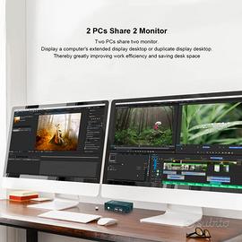Vendo come da descrizione, un KVM Switch 2x2 4K@60Hz doppio monitor per postazione tramite DisplayPort di Steetek. Lo trovate anche su amazon, potete verificare qualità e caratteristiche. Queste le caratteristiche principali: - KVM Switch Displayport Dual Monitor 2 In 2 Out: Displayport KVM Switch può controllare 2 computer con un solo set di tastiera e mouse e 2 monitor visualizzano il desktop principale di un computer e il desktop esteso. Si noti che questo KVM non supporta la conversione di sorgenti di segnale come DVI/VGA/HDMI in Displayport. Le docking station e gli adattatori non sono supportati sulle porte di ingresso. - KVM Switch Dual Monitor 4K@60Hz: Displayport KVM Switch dual monitor risoluzioni fino a 3840*2160@60Hz, retrocompatibili (es. 4K@30Hz, 1080p, ecc.) YUV4:4:4 ed è conforme a DP 1.2 predefinito. Ottieni immagini più nitide e colori più vividi. Si noti che la posizione della finestra della sorgente del segnale originale si sposterà dopo il passaggio, il che è un fenomeno normale. - Commutazione chiave e 4 porte USB 2.0: Lo switch KVM ha una funzione di commutazione con un tasto, ci vogliono 2-4 secondi per passare a un altro computer. Sono disponibili 4 porte USB 2.0 per la condivisione di unità USB, stampanti, webcam e altro ancora. Si noti che KVM non supporta la commutazione dei tasti di scelta rapida. - EDID intelligente e forte compatibilità: Lo switch KVM si adatta a EDID e rileva in modo intelligente la risoluzione del tuo computer. Allo stesso tempo, si adatta a una varietà di sistemi tradizionali, Windows 10/7/2000/XP, Mac, LUNIX, UNIX. - KVM Switch Dual Monitor: 2 PC 2 monitor switch,La confezione del prodotto include 4 cavi displayport, 2 cavi mini USB, 1 cavo micro USB. Assicurarsi che un totale di 6 cavi DP + 2 cavi mini USB siano collegati correttamente al KVM. Le docking station e gli adattatori non sono supportati sulle porte di ingresso. E' perfettamente nuovo. Prezzo di mercato 170 euro