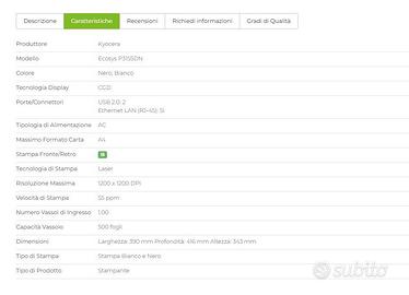 Kyocera Ecosys P3155DN. Tecnologia di stampa: Laser. Numero di cartucce di stampa: 1, Ciclo massimo di funzionamento: 250000 pagine per mese. Risoluzione massima: 1200 x 1200 DPI. Massimo formato carta serie ISO A: A4. Velocità di stampa (nero, qualità normale, A4/US Letter): 55 ppm, Stampa fronte/retro. Tipologia display: CGD. Rete pronta. Colore del prodotto: Bianco.
