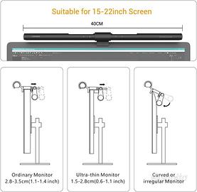Vendo causa inutilizzo, perfettamente funzionante lampada da monitor per pc. Il molto tempo trascorso a guardare lo schermo di un pc provoca affaticamento agli occhi e la lampada può offrire un aiuto. La lampada illumina il desktop in modo uniforme e previene efficacemente l'abbagliamento, il riflesso e lo sfarfallio sullo schermo. In questo modo il lavoro sarà più concentrato e confortevole. E’ possibile scegliere luce calda, luce fredda o luce naturale a seconda dei diversi ambienti. Si può variare l'intensità della luminosità tra 0% e 100%. Inoltre, la funzione di oscuramento automatico ti offrirà un'illuminazione più confortevole per gli occhi in base alle diverse situazioni. La funzione di memoria ti aiuta a ricordare la modalità di illuminazione che ti piace.