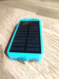 Powerbank con ricarica solare dotato di connessione USB out e una connessione di ricarica con trasformatore 5V. il powerbank è dotato di pile ricaricabili AA al suo interno. il powerbank ha una luce led. la base scomponibile funziona come lampada da tavolo e può essere alimentato direttamente da un trasformatore esterno (non in dotazione)