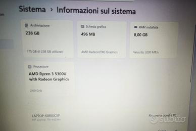 Vendo, causa inutilizzo, lap top hp 15", processore AMD REYZEN 3, scheda grafica AMD RADEON. Hard disk 300 GB, RAM 8GB