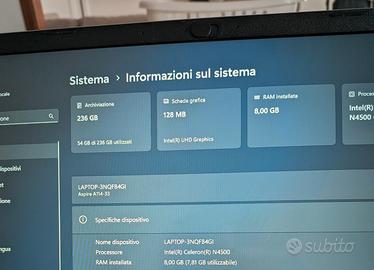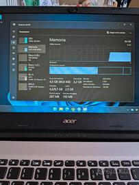 Laptop Acer a114-33 tenuto ottimamente con caricatore originale..caratteristiche in foto tra cui all'interno ben 2 ssd m2 da 128 l'uno...batteria tiene circa 3/4ore...Notebook davvero come nuovo E velocissimo