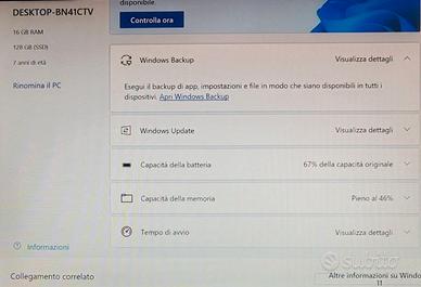 Salve vendo portatile Asus modello Vivobook Pro N580VN completo di alimentatore e confezione originale. Top di gamma di qualche anno fa pagato quasi 1.000 €, in perfetto stato estetico/ funzionale in quanto usato solo a casa, mai un problema, batteria al 67% della capacità (come da diagnostica, vedasi foto). Caratteristiche: case in allumino satinato, tastiera retroilluminata, display da 15,6” opaco antiriflesso full HD 1920x1080, CPU Intel core i7 7700HQ (Kabylake) @2,8 GHz (max 3,8), RAM 16GB DDR4, schede grafiche Intel HD630 (integrata) + Nvidia Gforce MX150 (2GB), due dischi di cui 1 SSD (da 128 GB dedicato all’OS) e 1 HDD (da 1TB per archivio dati), wifi 5 (802.11 ac), Bluetooth 4.2, 2 usb 2.0, 1usb C/display port, 1 usb 3.0, 1 lan RJ45, 1 HDMI, 1 card reader per schede SD esterne normali (non mini), cam frontale, minijack per cuffie/microfono. Al momento l’OS è doppio: Windows 10 (non aggiornabile a 11) e Linux (Mint). Quest’ultimo non va affatto male, sono obbligato a usare windows per lavoro sennò lo terrei volentieri come unico OS (e tanti saluti a Microsoft e alle sue vessazioni).