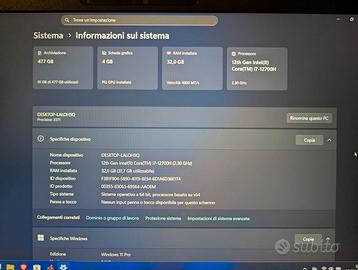 Portatile Dell Precision 3571 usato, con piccoli segni di usura. Caratteristiche tecniche: - Intel i7 - 12700 H - 2x16 GB Ram DDR5 4800 MT/s - NVME 512 GB (+ 1 slot libero) - NVIDIA QUADRO RTX A1000 VRAM UGB - schermo FHD 15.6" - 2x Thunderbolt 4 / USB - C uo gb/s - batteria 64 Wh Vendo con caricatore. Regalo borsa in foto per inutilizzo.