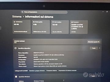 Vendo per passaggio a sistema desktop, notebook da gaming Lenovo IdeaPad L340-15IRH in ottime condizioni estetiche e funzionali. Il PC è perfetto per il gaming (Fortnite, Valorant, Minecraft, League of Legends, GTA V) e fluidissimo per studio, università o lavoro professionale. SPECIFICHE TECNICHE: Processore: Intel Core i5-9300H (fino a 4.10 GHz) Scheda Video: NVIDIA GeForce GTX 1650 (4GB GDDR5 dedicati) Memoria RAM: 16GBDDR4 Archiviazione: SSD 512GB NVMe (Velocissimo: avvio di Windows in meno di 10 secondi) Display: 15.6" Full HD (1920x1080) Anti-glare Tastiera: Retroilluminata Blue (molto comoda per scrivere/giocare di sera) MANUTENZIONE RECENTE (Gennaio 2025): Oltre all'upgrade della RAM, è stata effettuata la pulizia interna completa e la sostituzione della pasta termica con una di alta qualità. Il PC scalda pochissimo e garantisce le massime prestazioni anche sotto sforzo. 🔋 STATO BATTERIA E MANUTENZIONE: Salute Batteria: 82% residua (certificata da report ufficiale Windows del 28/03/2026). Garantisce ancora un'ottima autonomia reale Il PC è stato appena formattato e igienizzato. Windows è pulito e pronto alla prima configurazione. 📍 Disponibile per consegna a mano in zona o spedizione sicura tramite TuttoSubito. No scambi, massima serietà.