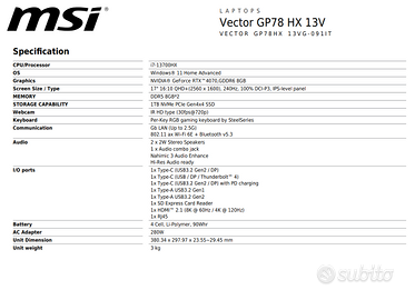 Come da titolo vendo Laptop da Gaming MSI Vector GP78HX 13VG-091IT in condizioni pari al nuovo, acquistato in data 31 Luglio 2024 (disponibile fattura). Vendo per inutilizzo. Consegna preferibilmente a mano ma disponibile anche nella spedizione. Faccio presente che non ho la scatola del laptop, utilizzata in passato per spedire il precedente laptop che utilizzavo. Sono disponibile ad effettuare test per dimostrare l'efficienza dell'hardware. Prezzo poco trattabile.