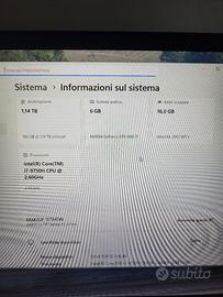 Vendo portatile da gaming hp omen 15 pollici modello 15-dc1050nl, computer perfettamente funzionante senza difetti, sempre tenuto con il massimo rispetto, da un paio di mesi è stata sostituita la pasta termica con della kryonaut conductonaut e la batteria. Completo di imballo originale intatto e caricatore originale Specifiche: Processore Intel® Core™ i7-9750H (frequenza di base 2,6 GHz, fino a 4,5 GHz con tecnologia Intel® Turbo Boost, 12 MB di cache, 6 core) Memoria SDRAM DDR4-2666 da 16 GB (2 x 8 GB) 2 slot di memoria accessibili all'utente; velocità di trasferimento fino a 2666 MT/s. Memorizzazione dati 256 GB PCIe® NVMe™ M.2 SSD SATA da 1 TB (7200 rpm) Grafica NVIDIA® GeForce® GTX 1660 Ti (6 GB di GDDR6 dedicati) Schermo Display FHD IPS antiriflesso con retroilluminazione WLED e diagonale da 39,6 cm (15,6") (1920 x 1080) Display Color Gamut 45% NTSC Brightness(typical) 220 nit Alimentazione Adattatore di alimentazione CA 200 W; Tipo di batteria Ioni di litio a 4 celle polimeriche, 70 Wh Porte 1 USB 3.1 Gen 2 Type-C™ con Thunderbolt™ 3 (velocità segnale 40 Gb/s, DisplayPort™ 1.4, HP Sleep and Charge); 3 USB 3.1 Gen 1 Type-A