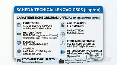 Vendo bellissimo laptop Lenovo G505, nella colorazione Nero Opaco, come visibile nelle foto di riferimento. Si tratta di un computer affidabile e versatile, perfetto per l'uso quotidiano, lo studio e il tempo libero. Originariamente nato con Windows 8/8.1, negli anni è stato aggiornato a Windows 10 Pro a 64 bit, che troverete già installato e configurato e migliorato nella RAM che è stata potenziata e portata a 16 GB. Nonostante questi miglioramenti, l’hardware originale rimane quello di un laptop di qualche anno fa. È un compagno ideale per la navigazione web, la gestione di documenti (Office, PDF), la visione di film o per lo studio. Lo sconsiglio invece per elaborazioni complesse come editing video pesante, gaming moderno o elaborazioni grafiche complesse, che risulterebbero troppo pesanti per il processore. Il Laptop è funzionante, ottimo per collezionisti o per chi necessita di un secondo dispositivo molto portatile per task semplici. L'articolo è completo dei suoi accessori: caricabatteria originale e una valigetta di trasporto nera in ecopelle (leggermente usurata). Specifiche Principali (come da configurazione attuale): •Processore: AMD E1-2100 APU (1.00 GHz) with Radeon™ HD Graphics •Memoria (RAM): 16 GB DDR3 (Aggiornata per massime prestazioni) •Disco Rigido (HDD): 1 TB (1000 GB) SATA •Schermo: 15.6" HD (1366x768) LED (Opaco, anti-riflesso) •Unità Ottica: Masterizzatore DVD-RW Interno •Connettività: Wi-Fi, Bluetooth, 2x USB 3.0, 1x USB 2.0, HDMI, VGA Le foto mostrano le reali condizioni estetiche del dispositivo. Il tutto è compreso nel prezzo. Vista la tipologia dell’articolo e la sua “delicatezza” preferirei che il ritiro avvenga di persona a cura dell’acquirente ma valuto anche possibilità di spedizione tracciata con il servizio TuttoSubito. Se siete interessati, non esitate a contattarmi. Prezzo poco trattabile. Guarda anche le altre mie inserzioni. Magari c'è qualcosa che può interessarti.