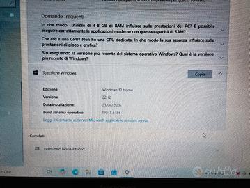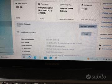 Lenovo Mod. OKBV4TE, tastiera QWERTY, sistema operativo Windows 10, RAM da 4gb, spazio effettivo di archiviazione 466gb, processore Intel core i3. La batteria consente ancora di poter lavorare per oltre mezz'ora. Viene venduto completo di caricatore.