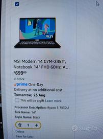 MSI Modern 14 C7M-245IT, Notebook 14" FHD 60Hz, AMD Ryzen 5 7530U, Radeon Graphics, 8GB DDR4 Onboard 3200MHz, 512GB SSD PCIe3, WiFi 6E, Win 11 Home. Usato pochissimo solo per lavoro. Adatto per light gaming e come workstation Prezzo nuovo: 699€