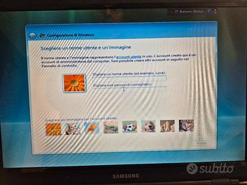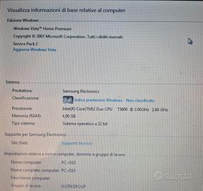 Laptop Samsung 4GB, Windows Vista Home edition, DVD RW integrato. Batteria non funzionante. Il laptop funziona tramite il suo alimentatore. Schermo esente da difetti
