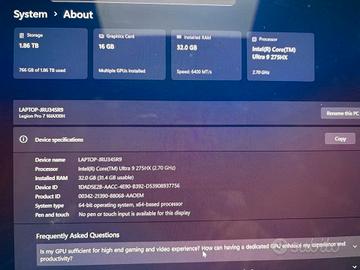 vendo incredibile legion pro con configurazione Gen 10 Ultra 9, 32GB, 2TB, RTX 5080, è la migliore config da poter creare per questa bestiolina, il notebook nonostante tutto è bello leggero e facile da maneggiare , le condizioni sono pari al nuovo e son stati effettuati solo 6 cicli di ricarica come da foto, nel prezzo sono inclusi tutti gli accessori ed anche uno zainetto legion per il suo agile trasporto!