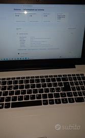 Vendo notebook Lenovo da 15,6 pollici. Il PC è molto veloce nell'accensione e nell'apertura dei programmi grazie alla combinazione di processore Intel i7, l'espansione a 12GB di RAM e il disco SSD. Processore: Intel Core i7-6500U, RAM: 12 GB DDR4, SSD da 480 GB, NVIDIA GeForce 920MX da 2GB dedicati. La scocca presenta segni di usura e rotture alla cerniera destra che ho sistemato (come visibile in foto), che però non ne compromettono il funzionamento. La batteria dura poco. Il caricabatteria è adattato. Vendo come danneggiato ma il computer funziona benissimo.