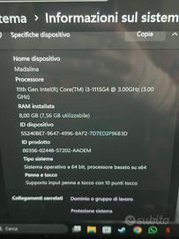 Intel Core i3-1115G4 (11ª gen) 8 GB RAM (3200 MHz) SSD da 238 GB (molto veloce) Intel UHD Graphics Display touchscreen (10 punti di tocco) Sistema operativo 64 bit 🔹 Punti di forza: ✔️ Rapido e fluido per uso quotidiano ✔️ Silenzioso e affidabile ✔️ Modalità tablet + laptop (2 in 1) ✔️ Perfetto per studenti e smart working 🔹 Condizioni: PC perfettamente funzionante in tutto Presente una piccola ammaccatura esterna La cornice plastica vicino allo schermo è leggermente sollevata 👉 Si tratta di difetti solo estetici, non influiscono su schermo, touch o prestazioni Tastiera con cover decorativa Batteria in buono stato ‼️Ritiro al carico dell’acquirente‼️