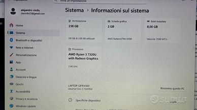 • Processore: AMD Ryzen 3 7320U con grafica Radeon (2.40 GHz).