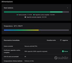 Usato veramente poco. Acquistato nel 2024 su Amazon, il portatile non ha ancora un anno. Tenuto sempre con le pinze, sempre in modalità "conservazione", MAI in "carica rapida" per preservare la batteria, infatti è in condizioni eccellenti come si vede dalla foto. MAI caduto, MAI overclockato.