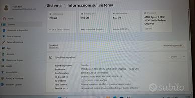Lenovo ThinkPad L14 Gen 2 (20X6) con Windows 10 Completo di Dock station, alimentatore e borsa Processore AMD Ryzen 5 PRO 5650U 6 core / 12 thread Frequenza base: 2.3 GHz (boost fino a ~4.2 GHz) Grafica AMD Radeon Graphics integrata Memoria condivisa (nel tuo caso ~496 MB dedicati + condivisa RAM) RAM 8 GB DDR4 3200 MHz Archiviazione SSD M.2 NVMe (tu: ~238 GB) Schermo 14 pollici Full HD 1920×1080 IPS opaco (anti-riflesso) Porte principali USB-A (3.2) - USB-C - HDMI - Ethernet (RJ45) - Jack audio - Docking Lenovo Connettività Wi-Fi - Bluetooth 🔐 Sicurezza TPM 2.0 Lettore impronte (opzionale) Webcam con privacy shutter Batteria Circa 45 Wh Peso Peso: 1.6 kg