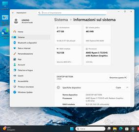 LENOVO Thinkbook 16 G7 Ryzen 5 7535HS 16 RAM 512 SSD NoteBook 16" Laptop PARI al NUOVO. ANCORA in GARANZIA. Usato pochissimo. Modello: Lenovo ThinkBook 16 G7 ARP Windows 11 PRO + Office 2024 PRO AMD Ryzen™ 5 7535HS 6 Core 12 Threads (3.3 GHz Turbo 4.55 GHz, 16 MB Cache) RAM 16 Gb DDR5 4800 MHz 2x slot SO-DIMM SSD 512 Gb NVMe™ PCIe® 4.0x4 + slot libero Display 16" (40.6 cm) IPS FHD LED (1920x1200) Grafica AMD Radeon™ Graphics 660M 2x USB 3.2 Type-A, 2x USB 3.2 Type-C (Thunderbolt™ 4/USB4/DP/PD) HDMI, Card Reader SD, LAN, Audio Jack Wi-Fi® 6E, 802.11ax 2x2, Bluetooth® 5.3 Tastiera Retroilluminata Premium Batteria Li-Ion 3 cell 71 Wh, circa 6 ore Completo alimentatore Per maggiori informazioni contattami Spedizione con tracciabilita tramite TuttoSubito