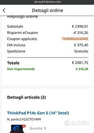 Vendo Lenovo ThinkPad P14s Gen 5 in condizioni pari al nuovo, acquistato a Giugno 2025 e utilizzato pochissimo. Configurazione professionale di fascia alta, ideale per lavoro, business intelligence, programmazione e utilizzo avanzato. Specifiche: - Intel Core Ultra 7 155H - 32GB RAM DDR5 - SSD 1TB PCIe - NVIDIA RTX 500 Ada 4GB - Display 14.5” 3K IPS, 120Hz, DCI-P3 - WiFi 6E, Bluetooth 5.3 - Tastiera retroilluminata ThinkPad Condizioni: - Pari al nuovo - Nessun segno evidente - Sempre utilizzato con cura Incluso: - Caricatore originale - Scatola originale Laptop solido e affidabile, tipico ThinkPad, perfetto per uso professionale senza compromessi. Motivo vendita: Passaggio a sistema diverso Consegna: Ritiro a mano o spedizione disponibile