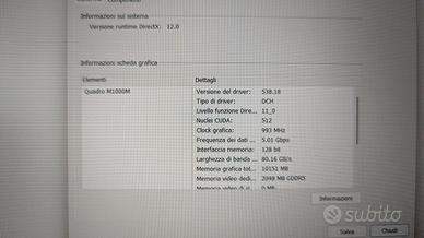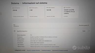 In vendita PC portatile Lenovo Thinkpad modello P50. ***ATTENZIONE: installata versione (attivata ed aggiornata) di Windows 11 PRO, nonostante la CPU non sia tra quelle supportate ufficialmente da Microsoft tutto gira bene e veloce, tutte le periferiche riconosciute.*** Il codice macchina è 20EN-0005GE: PC prodotto a Giugno 2017 e non piú in garanzia. Tastiera NON retroilluminata, layout italiano: NO ADESIVI!!! Eventualmente possibilità di averlo con tastiera retroilluminata layout QWERTZ Tedesco, al posto di quella italiana. Display 15,6" FHD (1920x1080): nessun segno, nessun punto di pressione. Color calibrator by Pantone. Usato: qualche segno di utilizzo sia sopra che sotto ma in condizioni estetiche più che buone. Manca il "piedino antiscivolo" in gomma sulla batteria (foto). Pulito completamente all'interno, pasta termica sostituita con pad termico (Honeywell PTM7950) sia su CPU che su GPU, sanificato con l'ozono. Tutto completamente funzionante! Specifiche: Processore: intel i7-6700HQ (4C/8T, 2,6-3,5 GHz, 6 MB) con vPro Grafica: nVidia Quadro M1000M 2Gb + intel HD graphics 530 integrata RAM: DDR4-2133, 16 Gb (4x4Gb, 4 moduli uguali) Memoria di archiviazione: M.2 256Gb SSD SATA (modello Samsung MZNLN256HAJQ-000L7 con 18376 ore) Fotocamera: HD 720p Batteria: interna da 90Wh (e 352 cicli) WLAN + Bluetooth(TM): intel WiFi AC8260+ Bluetooth 4.1 Combo Adapter Lettore di schede: SD full size Display: 15,6 pollici,FHD (1920x1080), 250 nits Other: fingerprint reder, smart card reader, pantone color calibrator Sistema operativo: Windows 11 PRO (completamente attivato ed aggiornato); è presente licenza nel BIOS. Alcune note: 1- macchina usata, ben tenuta ma con qualche segno: guarda le foto oppure chiedimene pure di nuove. Tutto comunque nelle foto è stato fotografato, volutamente, in modo molto peggiorativo di quanto sia in realtà. 2- caricatore originale da 170W. Consegna a mano in zona Venezia, logicamente con possibilità di qualsiasi prova.